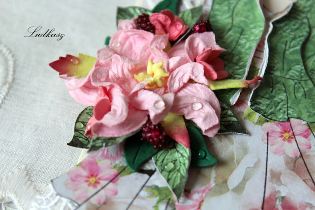 Ja przygotowałam kartkę z Lalą Nutting. Wykorzystałam papiery Altair z kilku kolekcji, łącząc je ze sobą. Tło też delikatnie postemplowałam. Do bukietów dołożyłam stemplowane na papierach Altair Art liście.