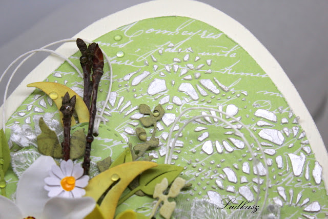 Papiery Lemoncraft, śliczne wiosenne kwiaty do Danusi Ficner, stokrotki moje :) Do tego patyczki nazbierane na spacerze-to dla mnie rodzaj recyklingu, bo dostały drugie życie. Maska, koronka, dwa tagi ukryte pod kwiatami trochę liści wykrojnikowych i to cały przepis :)