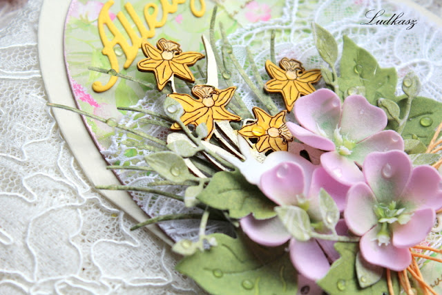 Papiery to chyba Mintaye wiosenne, Kwiatki różowe od Danusi Ficner a tekturka z żonkilami wg mojego projektu. W bukiecie ukrył się mały zajączek :)